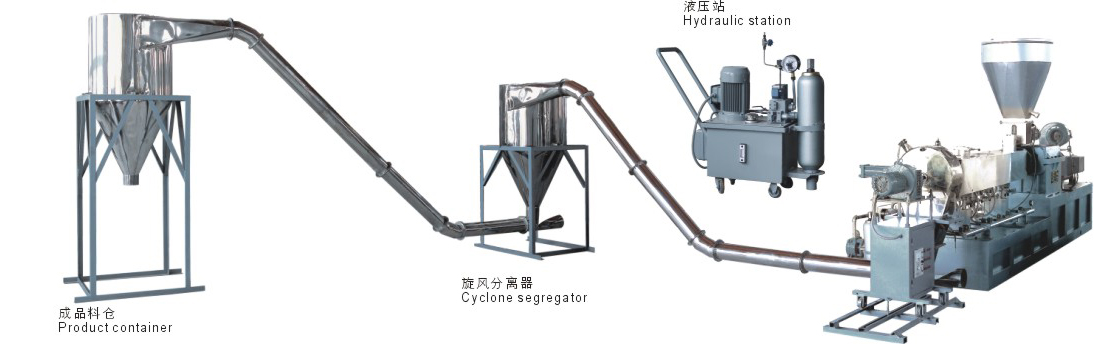 該設(shè)備可由雙螺桿擠出機實現(xiàn)對物料的剪切、混煉, 由單螺桿擠出機完成擠出、造粒。科學(xué)